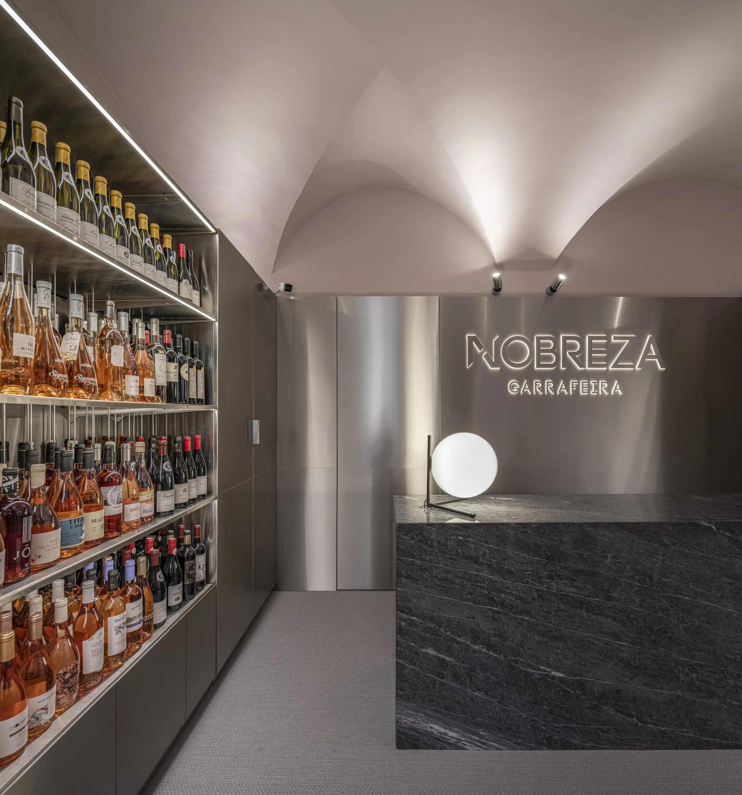 Garrafeira Nobreza é um projeto de arquitetura e design de interiores que permite, a partir do desenho do mobiliário com formas fluidas, criar uma relação com a pré-existência, ao mesmo tempo que cria uma nova identidade ligada de espaço de garrafeira, com temas e materiais ligados à fabricação do produto que se pretende vender.